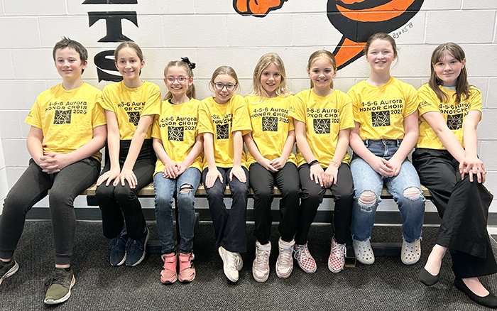Ten Henning students were carefully selected as one of the outstanding young Minnesota choral musicians from hundreds of applications. Henning music teacher Naomi Horn sent in individual recordings of each student singing a required song and a scale in January and was notified about a week or two later who made it in. The students worked hard to learn six pieces in and out of school, which they performed on Saturday, March 29, in St. Michael, Minn., in front of 2,500 people. Of the 10 that were picked from Henning, eight students decided to participate in the performance. Pictured are Timothy Larsen, Naomi Kodadek, Piper Greenwaldt, Mackenzie Andrews, Nora Mills, Koli Torgerson, Hannah Weller and Emmy Spires. The cost to be a part of this was $135 per person, but between scholarships awarded to a few students and donations from the Henning and Ottertail Lions clubs, it was completely covered for the students.