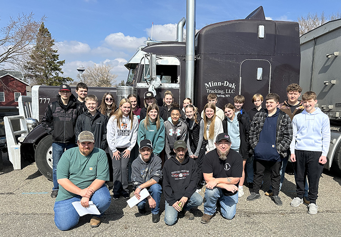 Bill Brady recently visited Henning School ninth grade driver education students to lead his annual semi-truck blind spot education class. Trainers this year included (left to right): Mitch Lund, Hammerlund Transport; Eldwin Davis, Bituminous Paving; Phil Cronk: Cronks Trucking and Bill Brady, LGI.