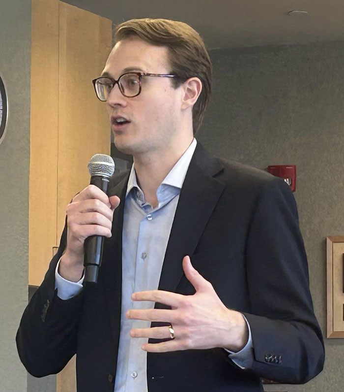 State Sen. Jordan Rasmusson spoke to county commissioners, county government personnel and county residents at the county Government Services Center in Fergus Falls.