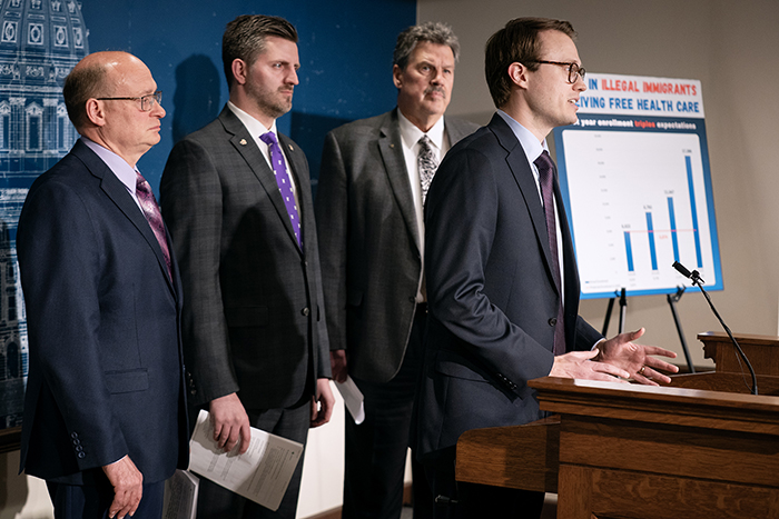 Senator Jordan Rasmusson speaks about the surge of illegal immigrants enrolling in free health care programs, while funding for vulnerable Minnesotans faces cuts. Behind Rasmusson, L-R, are: Republican Representative Jeff Backer (R-Browns Valley), Representative Isaac Schultz (R-Elmdale Township), and Senator Paul Utke (R-Park Rapids).