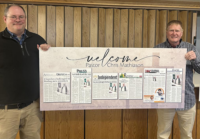 Zion Lutheran Church of Amor Pastor Chris Mathiason, left, and church member Gary Harrington hold a display of the seven newspapers in Otter Tail County which ran the story about Pastor Chris and pastor shortages in rural America.