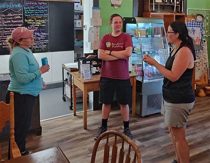 Seth Varner chats with Mackenzie Hamm and Karen Pifher at the Corner Collective during his stop in Frazee Monday, May 5. Varner learned about the origins of CornerStone and the Collective while sharing tidbits about his travels around the area including Monday stops in Hawley, Lake Park, Audubon, Ogema, Callaway, Detroit Lakes, Frazee, Vergas, Wolf Lake and his final stop of the day in Menahga.