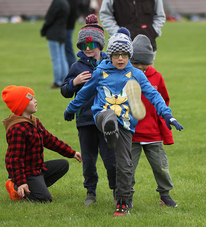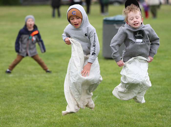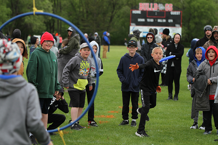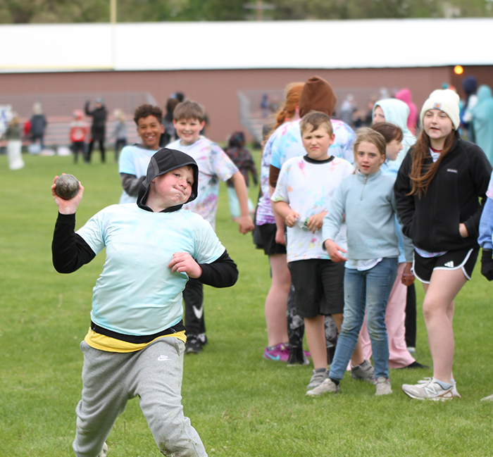 After inclement weather forced the postponement of the track and field day the week beforehand, Henning Elementary students, their friends and family gathered last Monday afternoon for the annual event. Among the highlights was the sack race (right), races on the track (below right), shot put (below left) and shoe kick (below). Dozens of people gathered to watch Reegan Hoelscher (above) attempt to throw a frisbee through a hula hoop during the frisbee toss last Monday.