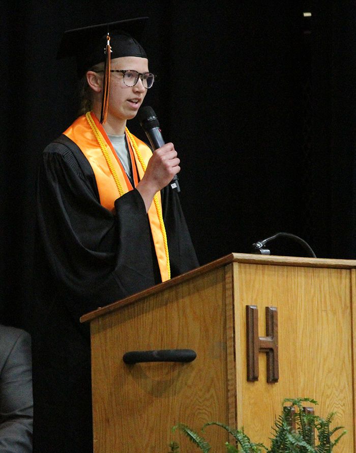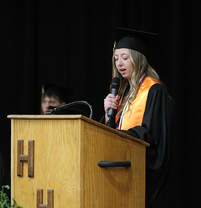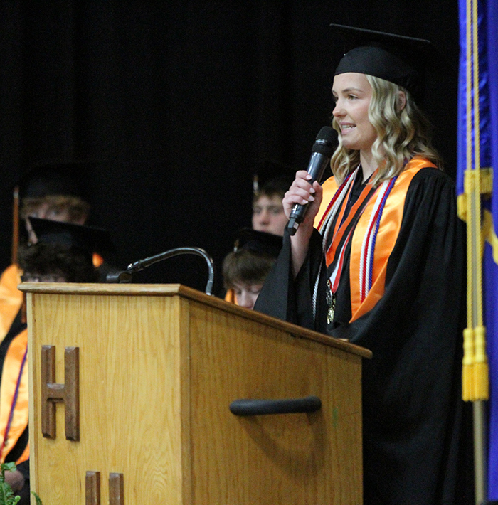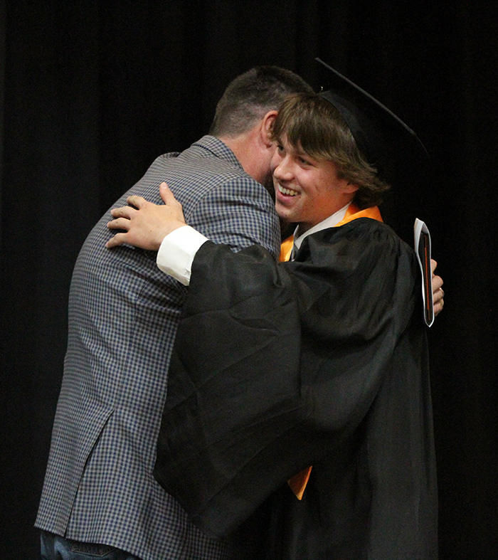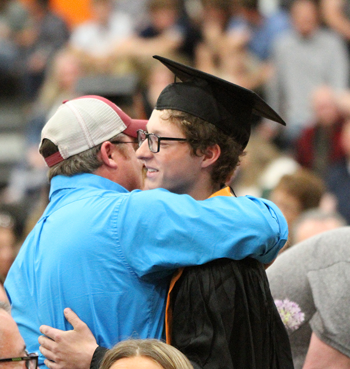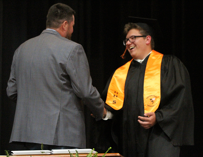 The Henning High School Class of 2025 received their high school diplomas on Friday night. During the ceremony, students including Colton Jacobs (above) gave their parents a flower and a hug to thank them for their support through the years. Students, including Jack Reinbold (above) and Logan Kostelecky (below), pranked school board member Matt Reinbold by handing him a large marshmallow before receiving their diplomas.
