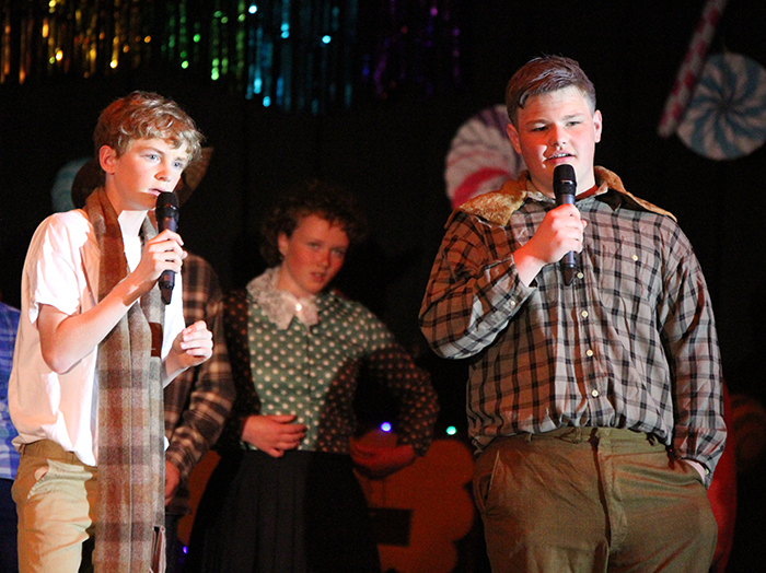 The Henning seventh and eighth grade choir students hosted their annual spring musical last Monday night. The students performed Willy Wonka Jr. in front of a large crowd of family and friends. Playing the part of Willy Wonka was Ryker Thalmann (above), while the part of Charlie was played by Easton Misegades (below right). Other parts included: Tony Castro (Augustus Gloop) right, Elijah Lynch (Grandpa Joe) left, as well as Aidan Olson (Mike Teavee) and Shadley Bunkowski.