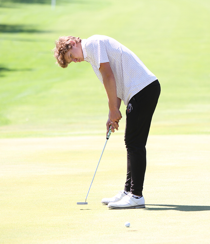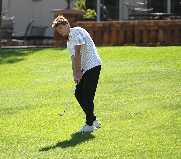 Teigan Bjerke (above) and Logan Kostelecky (below) competed at a home golf meet at Thumper Pond earlier this season. Kostelecky is one of two Otter Tail Central golfers to advance to state.