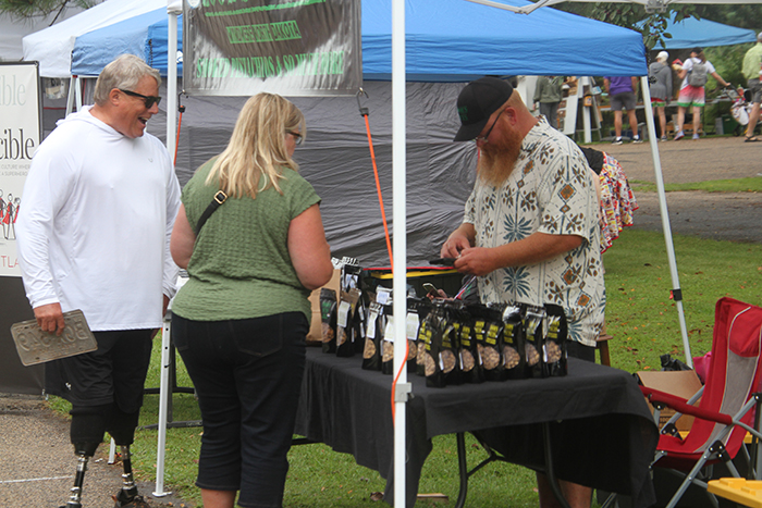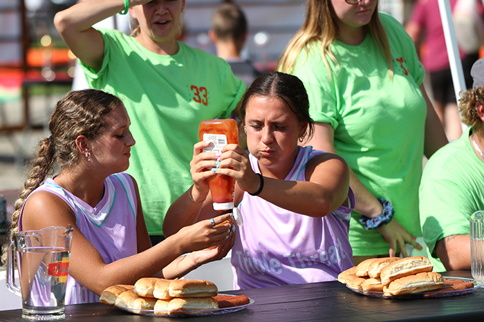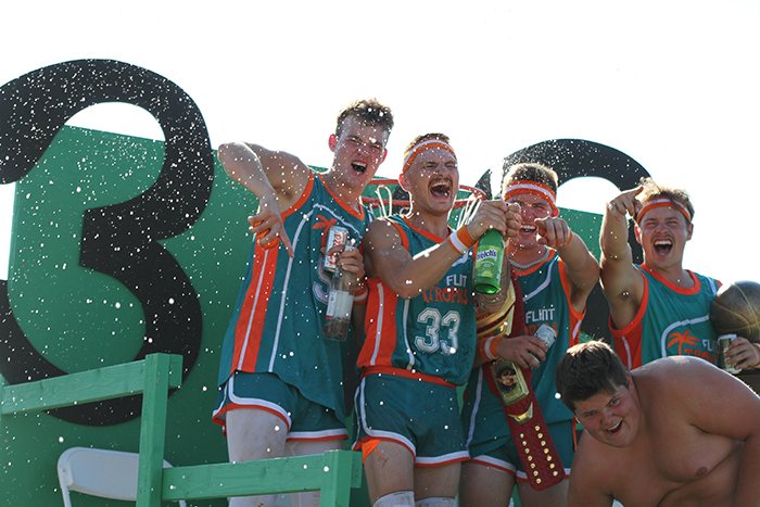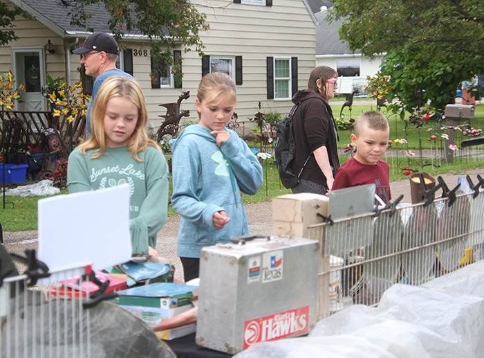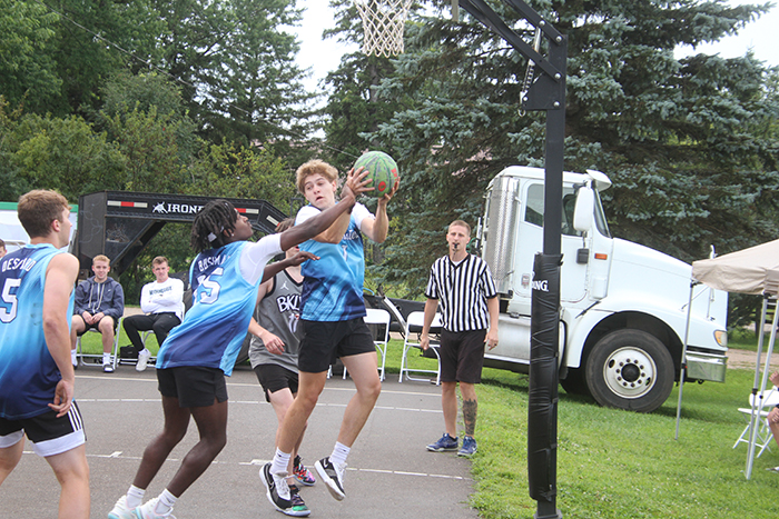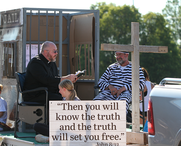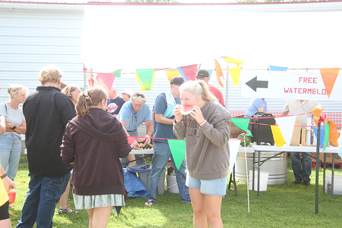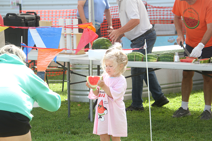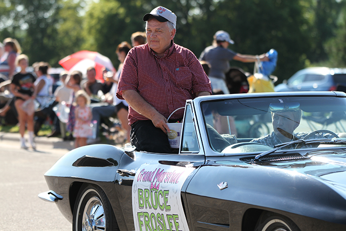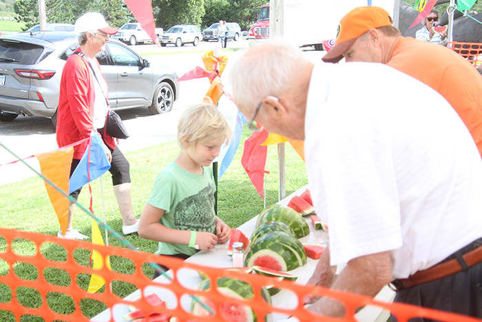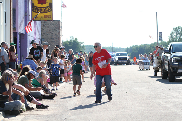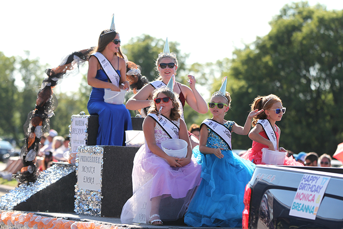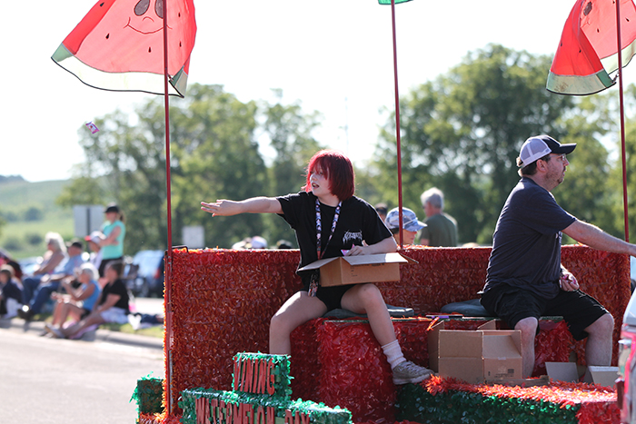 The Vining OG’s (above) popped the top of a bottle of sparkling grape juice during the annual Watermelon Day parade on Saturday evening. The team captured first place at the third annual Jacob Quam Foundation 3 vs 3 basketball tournament. The group rode at the top of the Jacob Quam Foundation float in the parade. Other parade entries included Bruce Froslee as grand marshal (above right), Leaf Mountain Lutheran Church (right), Henning Festival royalty (below right) who were celebrating a birthday on the float and the East Battle Lake Wastershed District (below).
