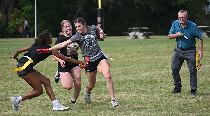 Kayetana Lopez-Moen attempts to avoid a “tackle” by seniors Myiesha Anonti and Monica Hansen during the annual Powder Puff football game on Wednesday afternoon on the football field. The game was one of several activities that were held throughout the week as part of homecoming festivities at Henning School. For more pictures and information about homecoming week, check out page 12.
