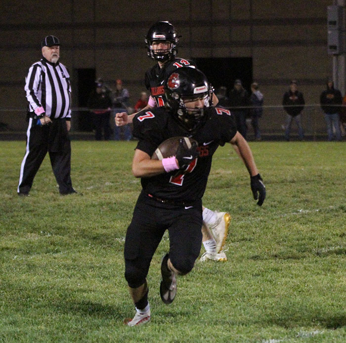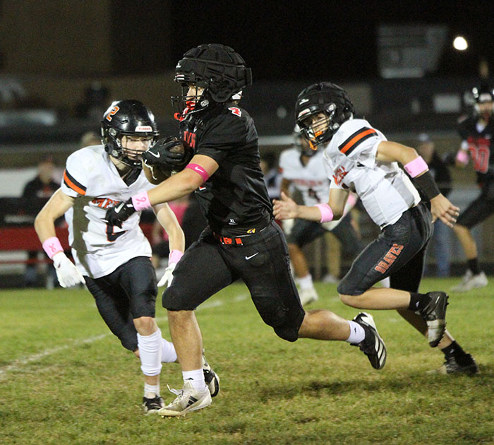 Trystan Loghry races past a pair of Menahga defenders during Friday’s 54-14 win over the Braves.