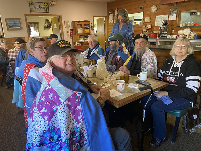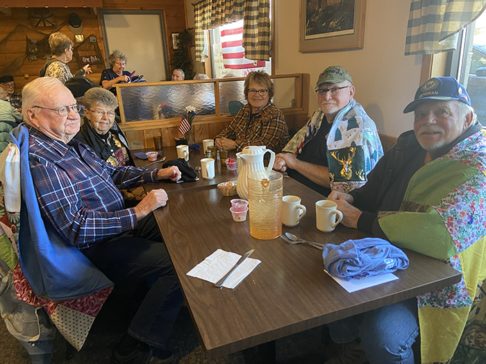 Approximately 65-70 people recently attended a veterans appreciation luncheon at the County Corner Cafe in Henning. Each veteran who attended the luncheon received a handmade patriotic quilt that was draped around them, as well as a thank you card and t-shirt. The luncheon was sponsored by the Country Corner Cafe and Thrivent.