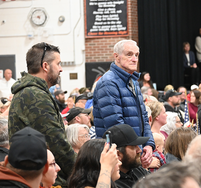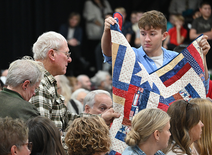 Above: Henning High School senior Ryan Despard presents a Quilt of Valor to a local veteran during last week’s Veterans Day program at Henning School. The quilts were just one part of an expansive program at the school. Right: Veterans were asked to be recognized and stand when their military song was performed by students at Henning School last week.