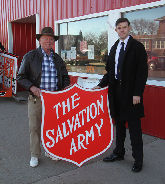 Bill Goepferd and Lt. Joshua Bowyer of the Salvation Army stand next to the former Salvation Army sign that hung outside of the Henning thrift store.