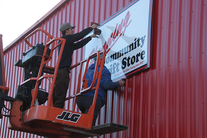 The new sign denoting the change from the Salvation Army thrift store to the Henning Community Thrift Store was hung on Friday morning in downtown Henning.