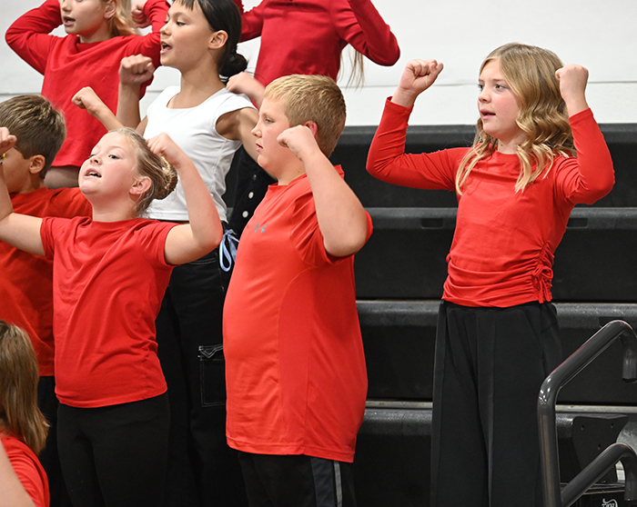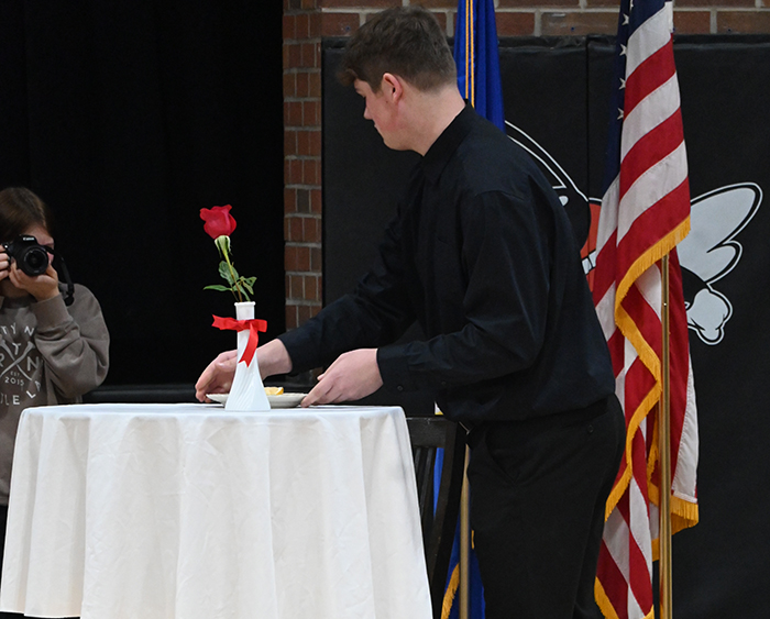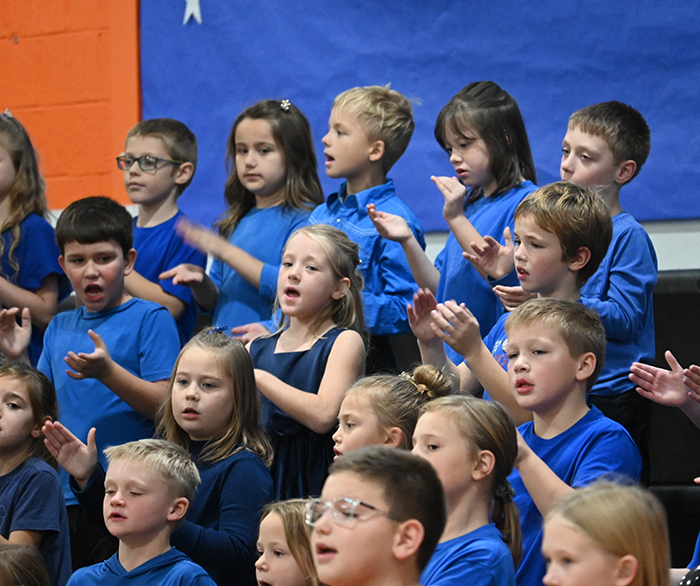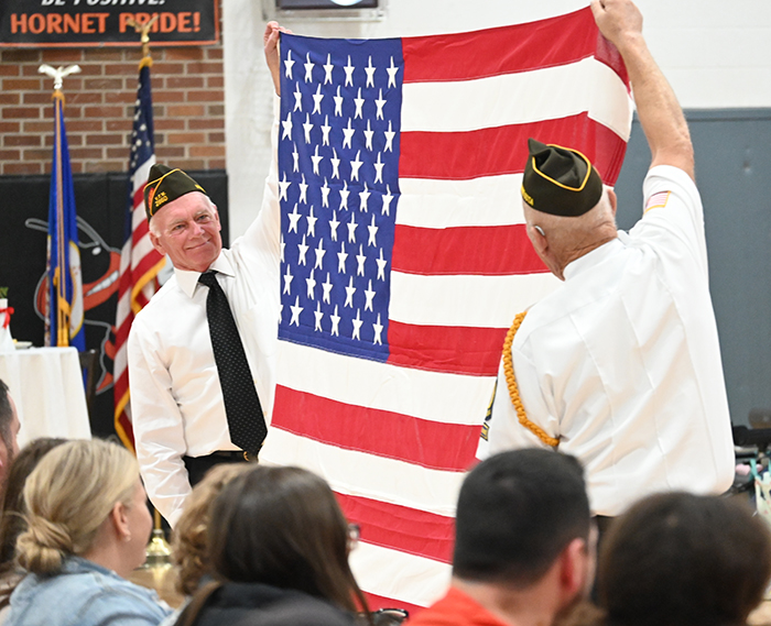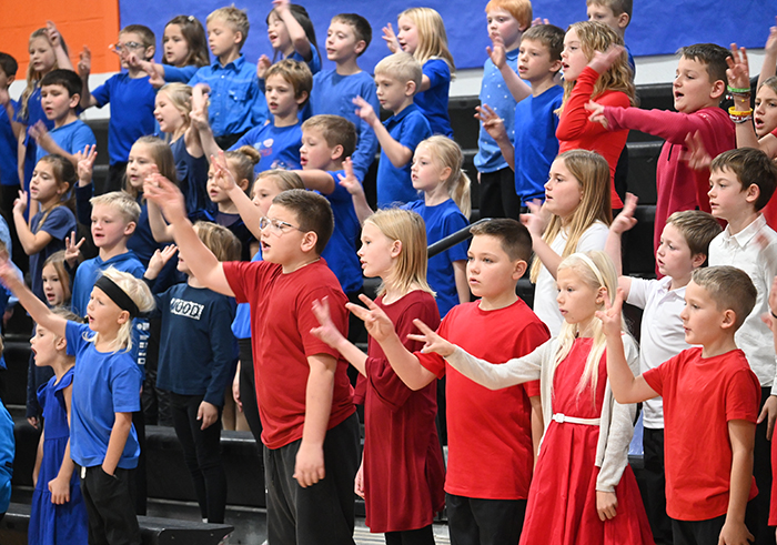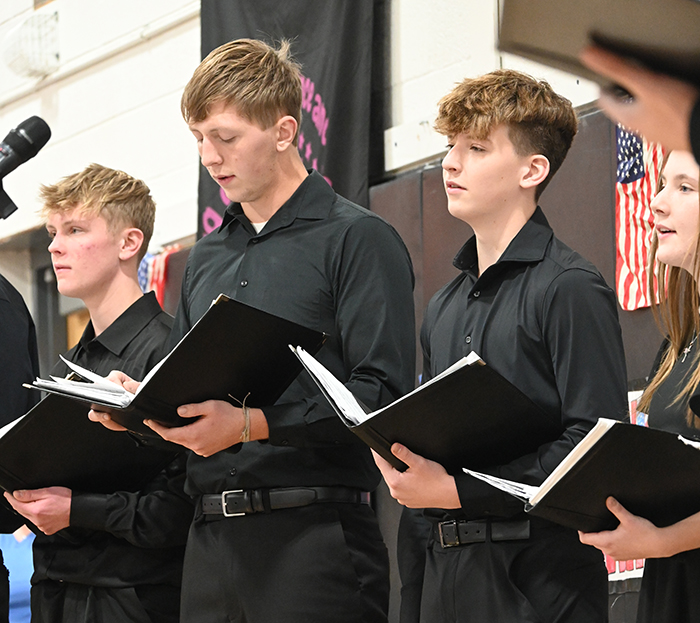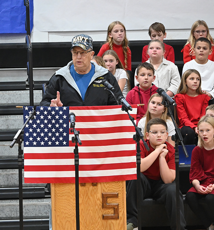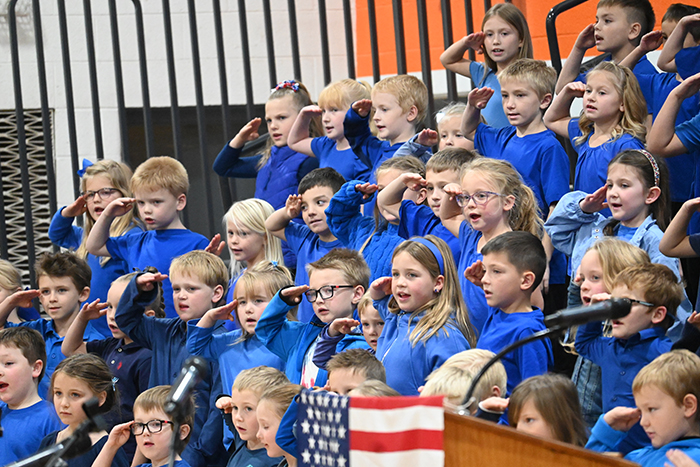 The Henning School gym was filled on Wednesday afternoon for the annual Veterans Day program at the school. The program featured students in grades K-5 performing a variety of songs to honor the sacrifices made by local veterans. The day included a Quilts of Valor presentation (right), as well as a guest speech by Doug Thorson (bottom left). Cade Strege and Breanna Bunkowski (middle right) presented the Missing Man Table, while Bill Goepferd and Bernal Cichy presented a ceremonial flag folding demonstration last week. In addition to the elementary students, Brenden Weller, Will Schwartz and Beck Thorson, as well as the other members of the Chamber Choir, performed the song Thankfully last Tuesday afternoon (bottom middle).