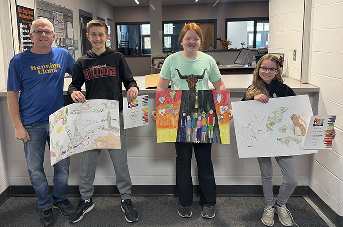 Jaeger Sapp took first place in the Henning Lions Club Peace Poster Contest. The theme for this year’s Peace Poster contest was Together As One. Due to age restrictions, second place finisher Piper Greenwaldt will have her poster advance to the next round of the international contest. Taking third place in the local contest was Makayla Menze. Pictured above: Jon Dreyer, Jaeger Sapp, Makayla Menze and Piper Greenwaldt.
