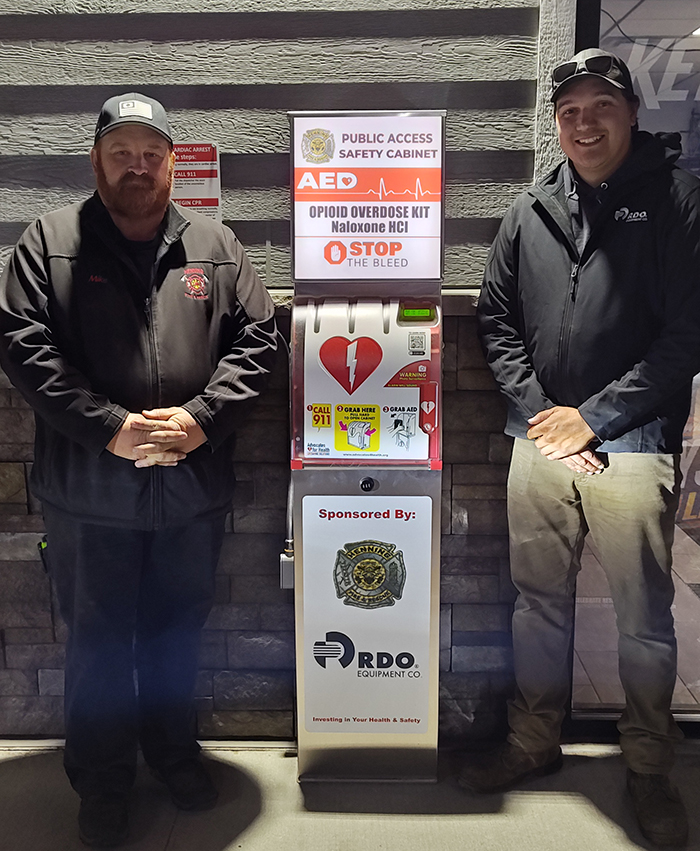 Henning Police and Fire Chief Mike Helle is pictured with Jon Eckhoff of RDO next to the new AED outside of Northstar Gas and Grocery in Henning.