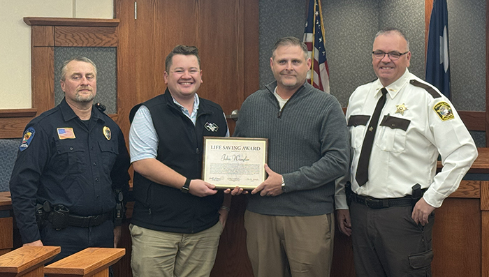 John Wangler, third from the left, was presented a Lifesaving Award during last week’s New York Mills City Council meeting after saving the life of Marlene Brown last year. Brown had fallen on the railroad tracks while a train was coming her way. He is pictured with NY Mills Chief of Police Bobby Berndt, NY Mills Mayor Latham Hetland and Otter Tail County Sheriff Barry Fitzgibbons.