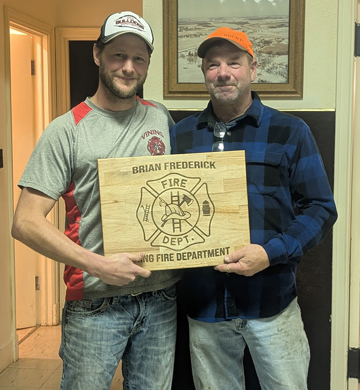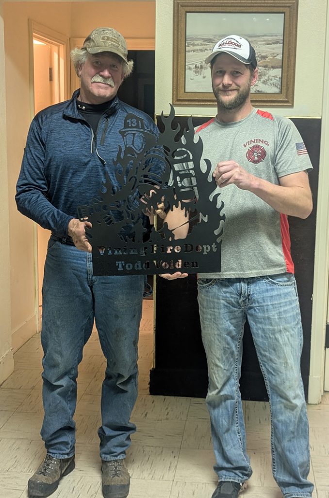 Two members of the Vining Fire Department were recognized at the annual fireman supper last week for their years of service on the volunteer fire department. Todd Volden and Brian Frederick recently retired from the department and are pictured with Vining Fire Chief Adam Schwartz.