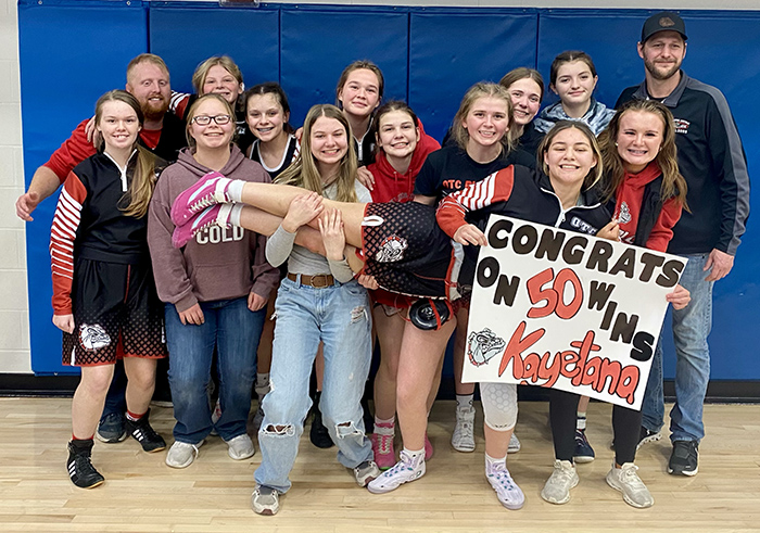 Kayetana Lopez-Moen celebrates with her teammates on Friday night after picking up her 50th career win. The Otter Tail Central junior picked up the win in the first-ever dual wrestling match for the OTC girl wrestling team.