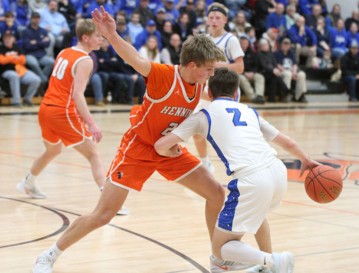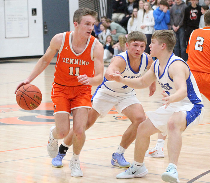 Kale Misegades drives past a pair of New York Mills defenders on Tuesday night in Henning. On Thursday, Misegades became the all-time leading scorer in Henning School history.