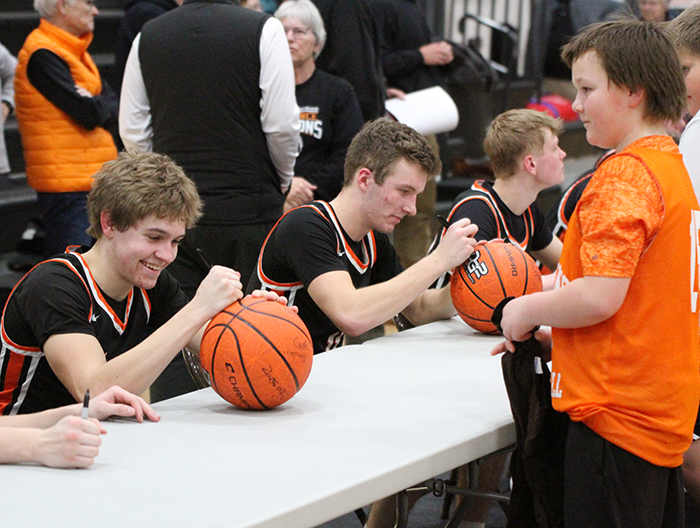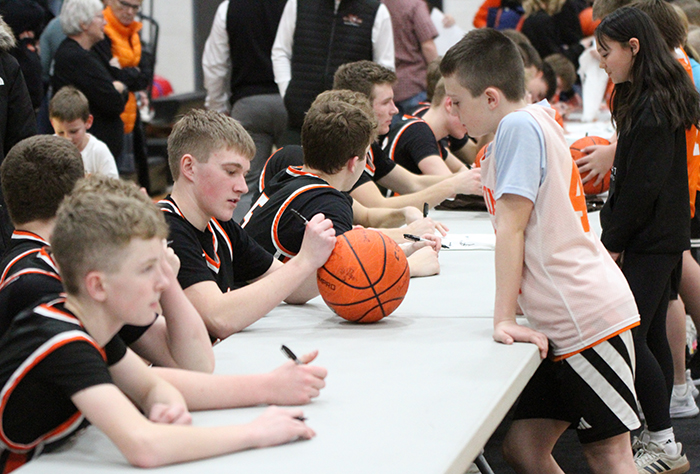 John Saari (above) and Judah Horn (right), waited in line for an autograph from a member of the Henning boys basketball team as part of the annual youth/autograph night at Henning School on Friday night. All of the local youth who attended the game received a free poster for an autograph, while others opted to have basketballs signed by their favorite basketball player. In addition to autographs, local youth in grades K-6 played at halftime of the c-squad, JV and varsity games on Friday.
